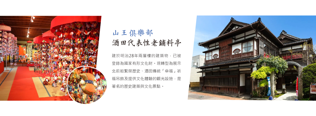 位於山形縣酒田市的「山王俱樂部」,曾是酒田代表性的老鋪料亭,建於明治28年兩層樓的建築物,已被登錄為國家有形文化財。現轉型為展示北前船繁榮歷史、酒田傳統「傘福」祈福吊飾及提供文化體驗的觀光設施,是著名的歷史建築與文化景點。