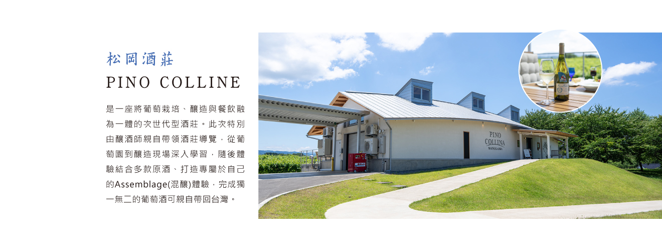 在山形縣鶴岡市豐饒自然環抱下的松岡酒莊(PINO COLLINE),是一座將葡萄栽培、釀造與餐飲融為一體的次世代型酒莊。酒莊以順應自然的栽培方式與重力流釀造技術,細膩呈現土地風土的獨特個性,其酒質獲得山形GI認證等高度評價,並受到國內外矚目。此次特別由釀酒師親自帶領酒莊導覽,從葡萄園到釀造現場深入學習,隨後體驗結合多款原酒、打造專屬於自己的Assemblage(混釀)體驗,完成獨一無二的葡萄酒可親自帶回台灣。行程亦包含精心設計的餐酒搭配午餐,讓美酒與料理相互輝映。以五感沉浸其中,享受只有在此才能體驗的大人系奢華時光。