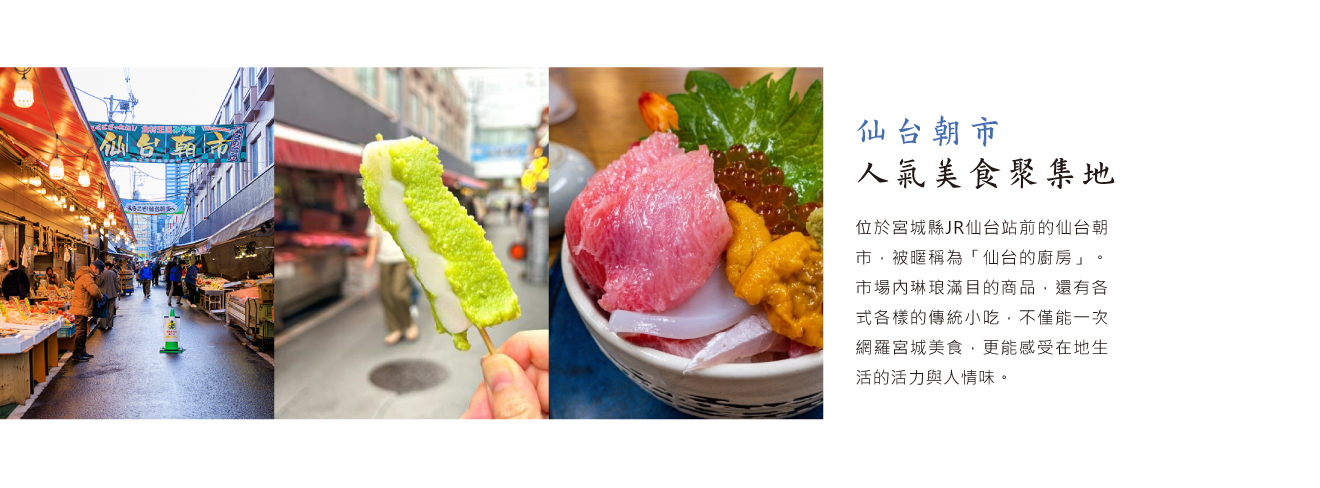 位於宮城縣JR仙台站前的仙台朝市,被暱稱為「仙台的廚房」。市場內琳琅滿目的商品,還有各式各樣的傳統小吃,不僅能一次網羅宮城美食,更能感受在地生活的活力與人情味。