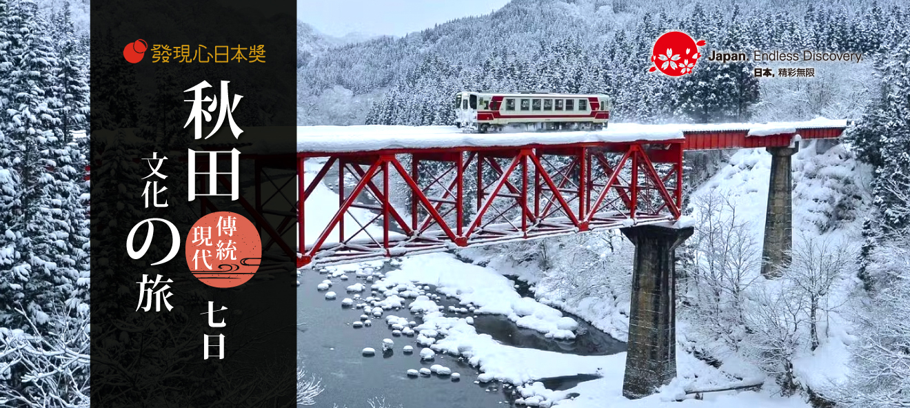 搭乘被譽為日本最漂亮、最原始的風景鐵道「秋田內陸縱貫鐵道」,悠哉的穿行在田野、平原及山區溪谷間,冬季時,從車窗望向秋田的群山,看著雪花飄落,累積,彷彿置身於古代的絕美水墨畫之中,成為難忘的旅行記憶。