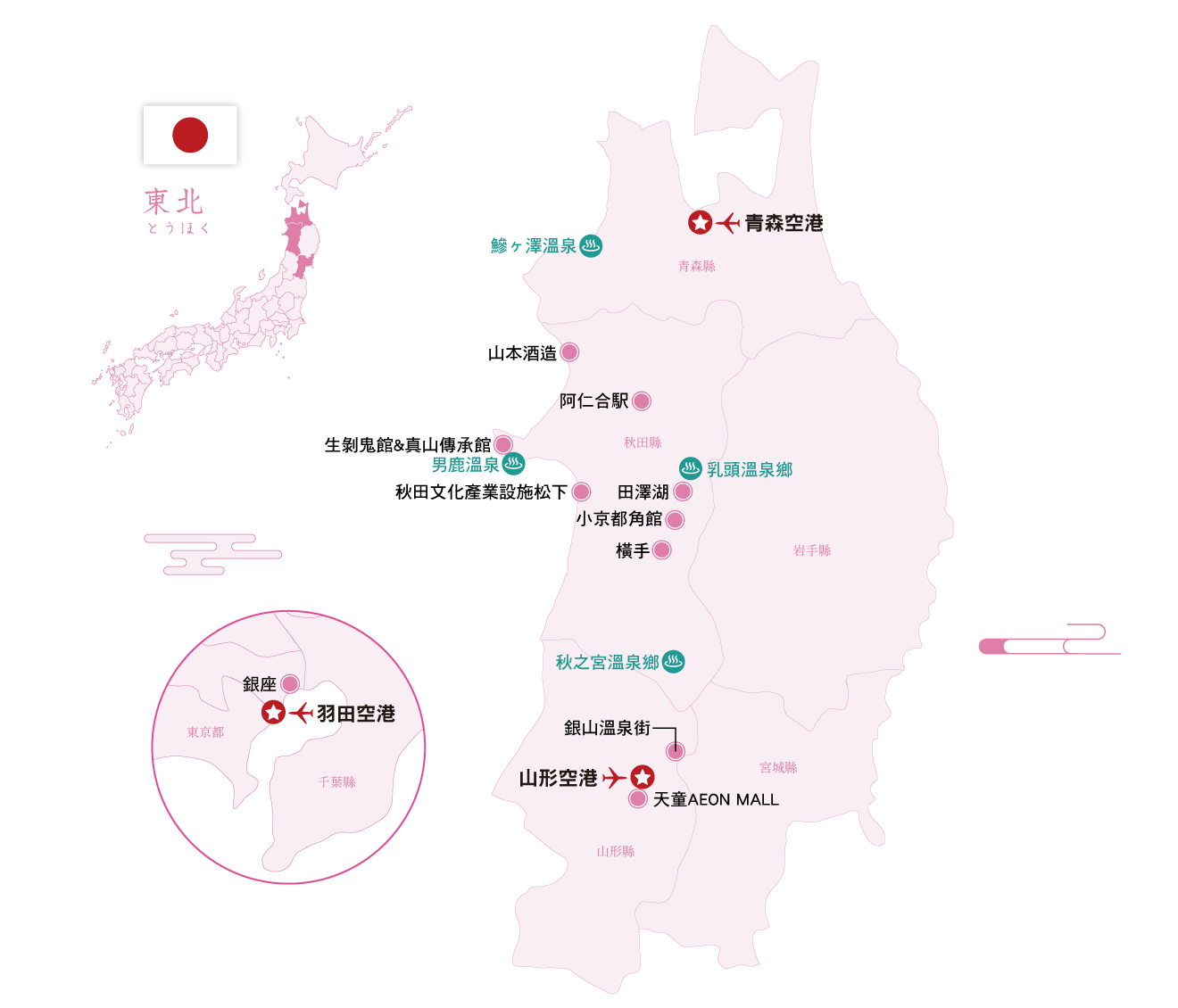 (依航班)在台北市內的松山國際機場集合,辦理出境手續後,搭豪華噴射客機飛往日本首都東京,抵東京機場,辦完入境手續後,利用時間逛江戶氣氛新式機場賣店,配合班機時間再集合。再搭機轉飛東北最北端產蘋果聞名的青森。抵後展開日本東北溫泉美食度假之旅。