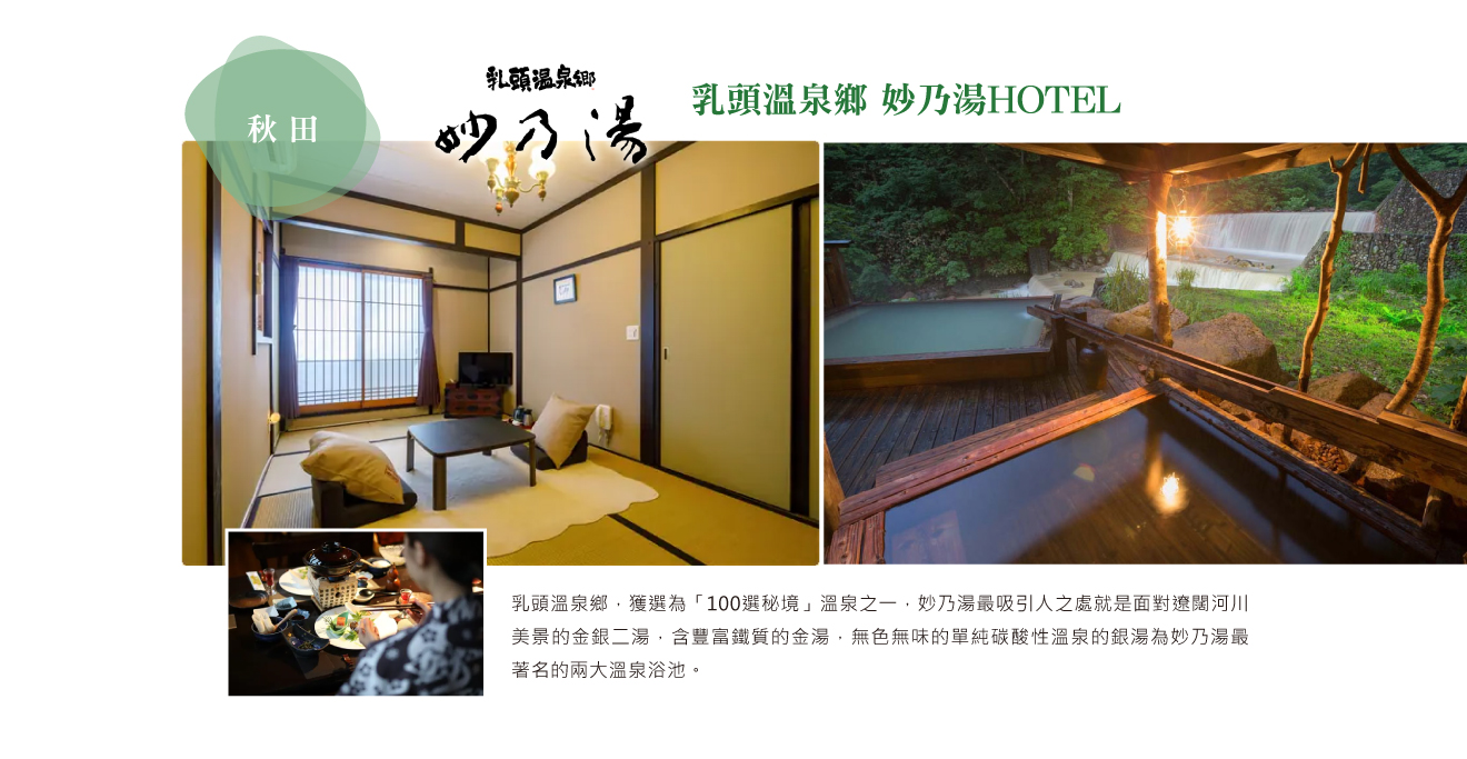 坐落於秋田縣仙北市的乳頭溫泉鄉,因乳頭山而得名。由7間風貌截然不同的溫泉飯店組成,每處溫泉不只建築各具特色,連泉質都有所差異。散佈於原始山毛櫸樹林間的溫泉被譽為祕境溫泉,又因保留著日本原始風景的自然環境、充滿懷舊風情的旅館,以及泉質優異的濁湯而博得眾多溫泉控的喜愛。