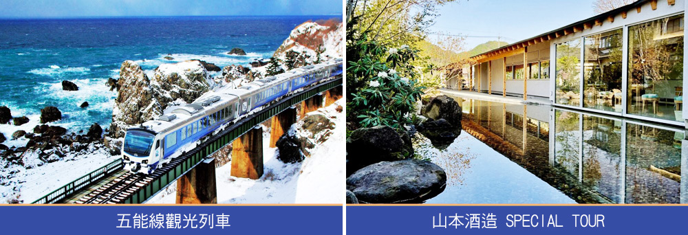 搭乘五能線觀光列車「白神號(リゾートしらかみ)」,沿途可愜意地飽覽窗外湛藍的海洋和雪白的山巒及田園風光,讓您暫時脫離日常的忙碌生活,悠閒的感受五能線的獨特魅力。
