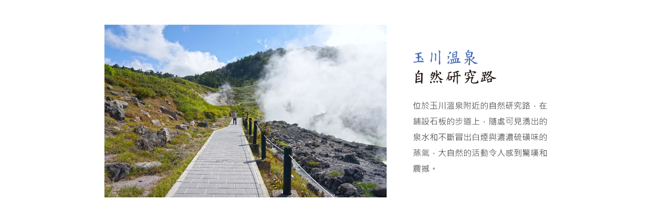 位於玉川溫泉附近的自然研究路,在鋪設石板的步道上,隨處可見湧出的泉水和不斷冒出白煙與濃濃硫磺味的蒸氣,大自然的活動令人感到驚嘆和震撼。