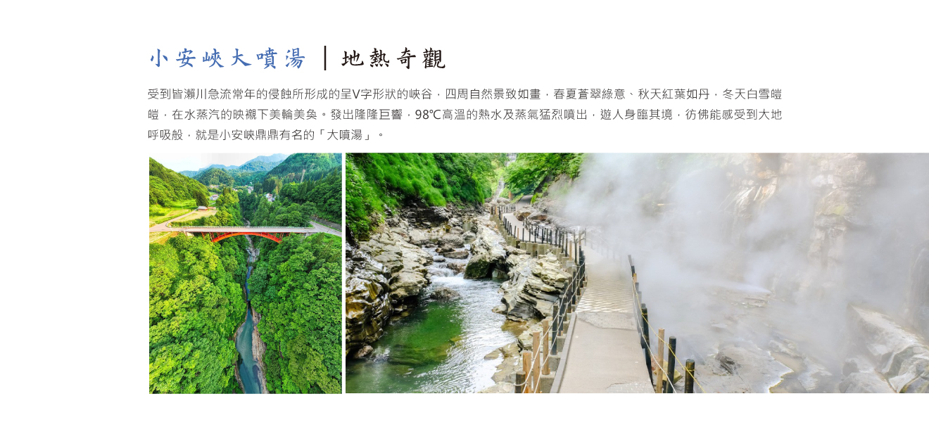 位於秋田縣湯澤市的小安峽是受到皆瀨川急流常年的侵蝕所形成的呈V字形狀的峽谷,四周自然景致如畫,春夏蒼翠綠意、秋天紅葉如丹,冬天白雪皚皚,在水蒸汽的映襯下美輪美奐。發出隆隆巨響,98℃高溫的熱水及蒸氣猛烈噴出,遊人身臨其境,彷佛能感受到大地呼吸般,就是小安峽鼎鼎有名的「大噴湯」。這個舉世罕見的地帽,由於地熱貯留層的龜裂,使得積存的蒸汽和熱水不斷噴出,濃密瀰漫的蒸氣所呈現的光景震撼力十足,還有「地獄釜」之稱。江戶時代的旅遊作家菅江真澄曾造訪此地時,在高松日記中寫道「熱水猛烈噴出,四處飛濺,宛如雷神打鼾般隆隆作響」描述當時的景象。