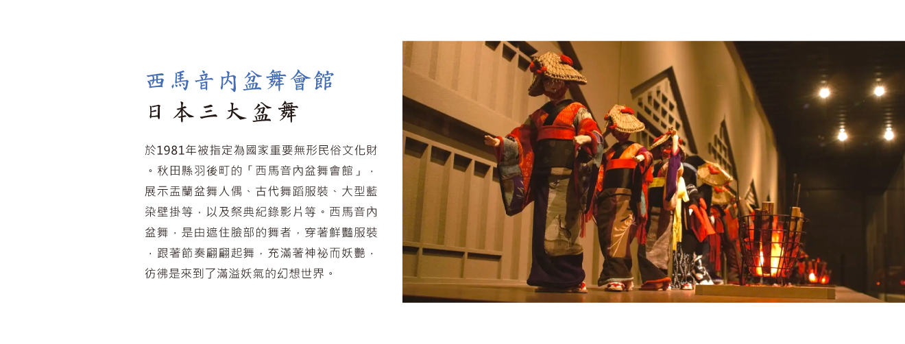 秋田縣的「西馬音內盆舞」與德島縣的「阿波舞」及岐阜縣的「郡上八幡盆舞」被列為日本三大盆舞。而「西馬音內盆舞」,於1981年被指定為國家重要無形民俗文化財。秋田縣羽後町的「西馬音內盆舞會館」,展示盂蘭盆舞人偶、古代舞蹈服裝、大型藍染壁掛等,以及祭典紀錄影片等。西馬音內盆舞,是由遮住臉部的舞者,穿著鮮豔服裝,跟著節奏翩翩起舞,充滿著神祕而妖艷,彷彿是來到了滿溢妖氣的幻想世界。