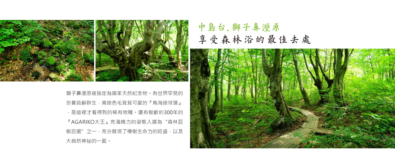 位於秋田縣仁賀保市櫸木原生林中的「中島台.獅子鼻溼原」,在廣大的溼原上,形態奇異的巨木林營造出神祕的空間。獅子鼻溼原被指定為國家天然紀念物。有世界罕見的珍貴苔蘚群生,青綠色毛茸茸可愛的『鳥海綠球藻』,是這裡才看得到的稀有物種。還有樹齡約300年的『AGARIKO大王』充滿魄力的姿態入選為“森林巨樹百選”之一,充分展現了櫸樹生命力的旺盛,以及大自然神祕的一面。這裡的空氣純淨清新,是享受森林浴的最佳去處。