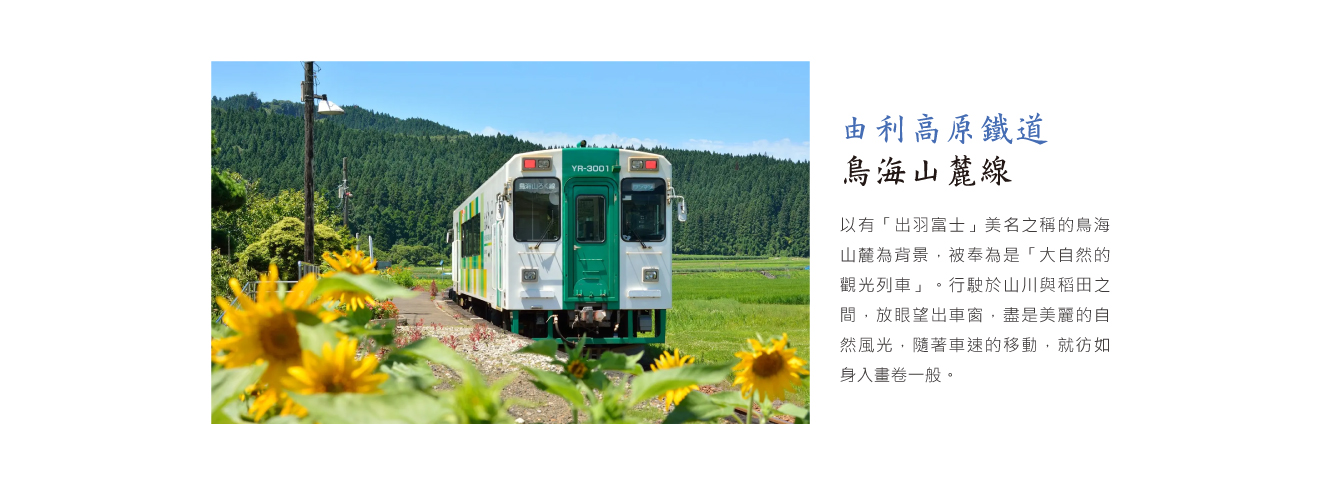 由利高原鐵道的鳥海山麓線(鳥海山ろく線),以有「出羽富士」美名之稱的鳥海山麓為背景,被奉為是「大自然的觀光列車」。行駛於山川與稻田之間,放眼望出車窗,盡是美麗的自然風光,隨著車速的移動,就彷如身入畫卷一般。春夏翠綠、秋季橘紅、冬季雪白,還有偶爾揮手打招呼的居民,隔著車窗都能感受到那質樸暖意。
