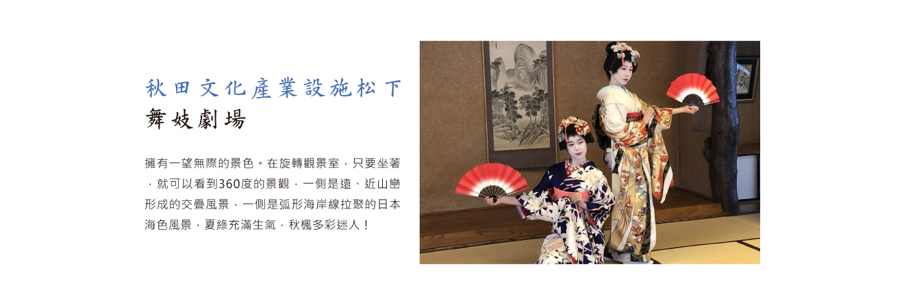 位於秋田縣秋田市的旅遊設施「秋田文化產業設施松下」,是由大正時代創立的『割烹松下』遺跡改建而成。其中最吸睛的就是在「秋田舞妓劇場」,欣賞身著華麗傳統服飾秋田舞妓優美的舞姿,感受大正時代上流人士風雅的生活樂趣。