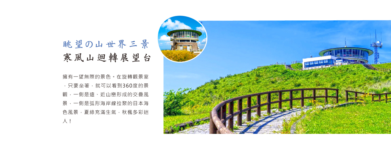 位於秋田縣男鹿市綠色葱鬱寒風山頂上的「迴轉展望台」,被譽為「眺望の山 世界三景 寒風山」,擁有一望無際的景色。在旋轉觀景室,只要坐著,就可以看到360度的景觀,一側是遠、近山巒形成的交疊風景,一側是弧形海岸線拉聚的日本海色風景,夏綠充滿生氣,秋楓多彩迷人!