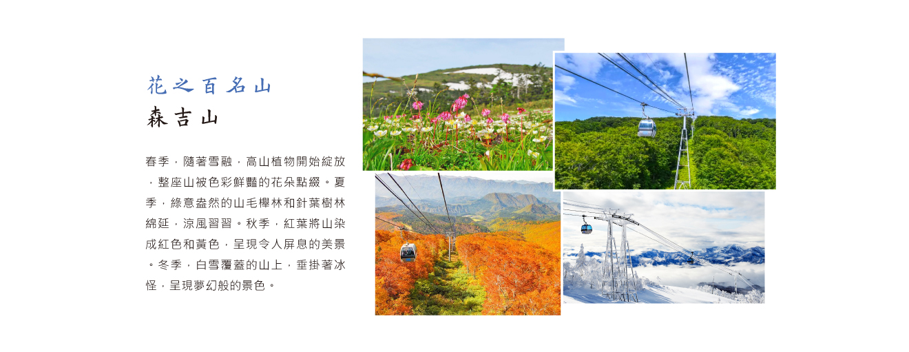 位於秋田縣北秋田市的「森吉山」,擁有「花之百名山」美名。春季,隨著雪融,高山植物開始綻放,整座山被色彩鮮豔的花朵點綴。夏季,綠意盎然的山毛櫸林和針葉樹林綿延,涼風習習。秋季,紅葉將山染成紅色和黃色,呈現令人屏息的美景。冬季,白雪覆蓋的山上,垂掛著冰怪,呈現夢幻般的景色。