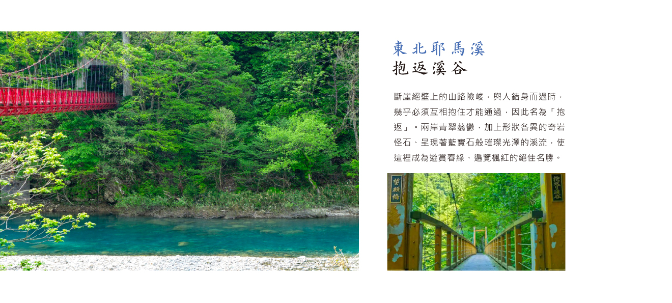 位於秋田縣仙北市被譽為「東北耶馬溪」的抱返溪谷,斷崖絕壁上的山路險峻,與人錯身而過時,幾乎必須互相抱住才能通過,因此名為「抱返」。兩岸青翠蓊鬱,加上形狀各異的奇岩怪石、呈現著藍寶石般璀璨光澤的溪流,使這裡成為遊賞春綠、遍覽楓紅的絕佳名勝。