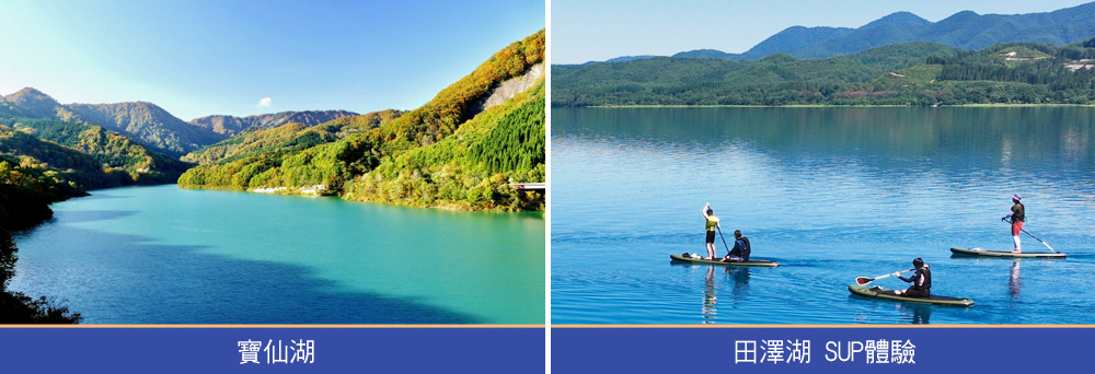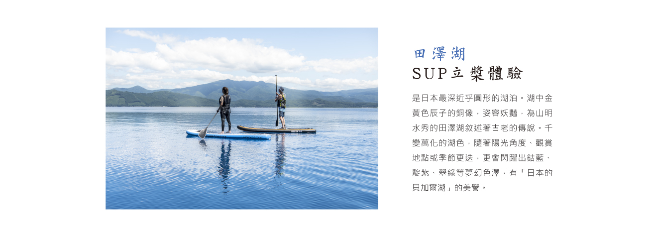 位於秋田縣清澈碧藍的田澤湖,是日本最深近乎圓形的湖泊。湖中金黃色辰子的銅像,姿容妖豔,為山明水秀的田澤湖敘述著古老的傳說。千變萬化的湖色,隨著陽光角度、觀賞地點或季節更迭,更會閃躍出鈷藍、靛紫、翠綠等夢幻色澤,有「日本的貝加爾湖」的美譽。特別安排SUP體驗,在雄偉群山圍繞的清澈透明湖面上划行,從全新角度欣賞秋田的自然之美。
