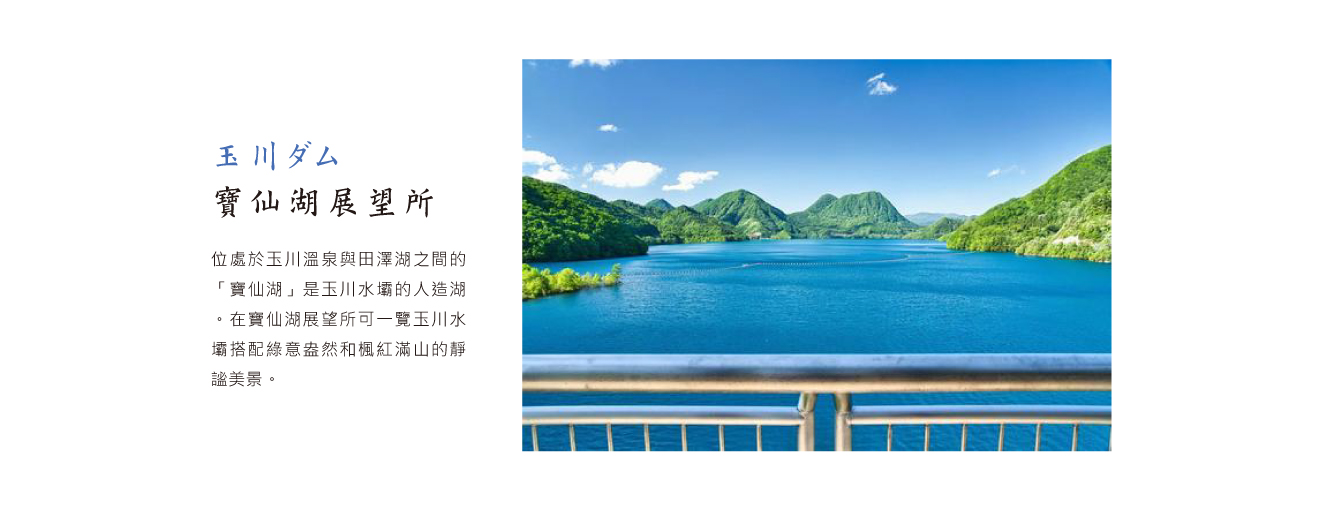 位處於玉川溫泉與田澤湖之間的「寶仙湖」是玉川水壩的人造湖。在寶仙湖展望所可一覽玉川水壩搭配綠意盎然和楓紅滿山的靜謐美景。