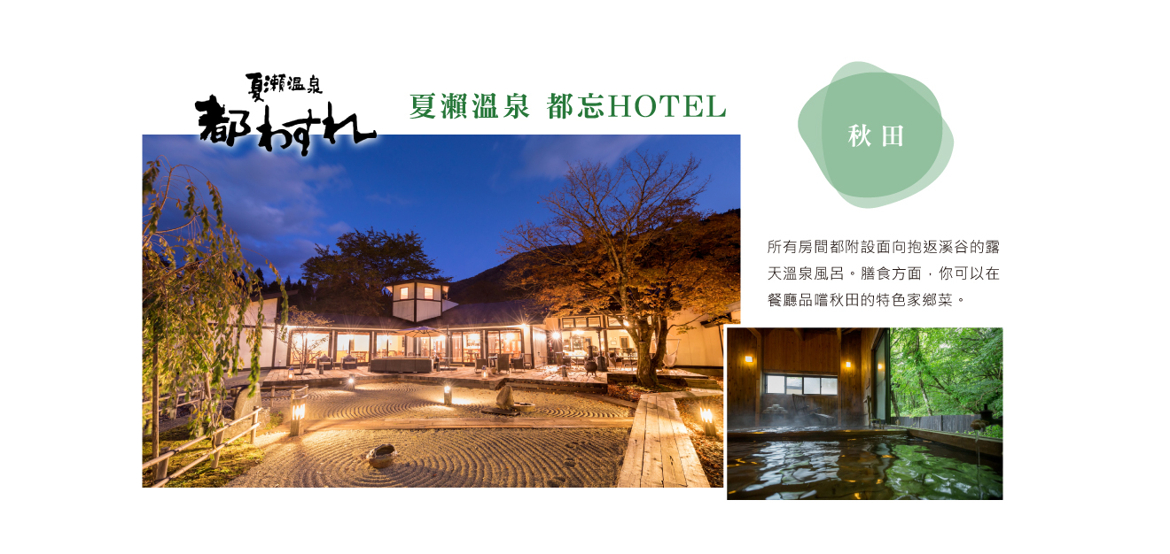 夏瀨溫泉─(陸奧小京都)角館古街散策─角館樺細工傳承館(杯墊體驗)─秋田內陸線(復古觀景鐵道)鄉間美景─森吉山─男鹿溫泉