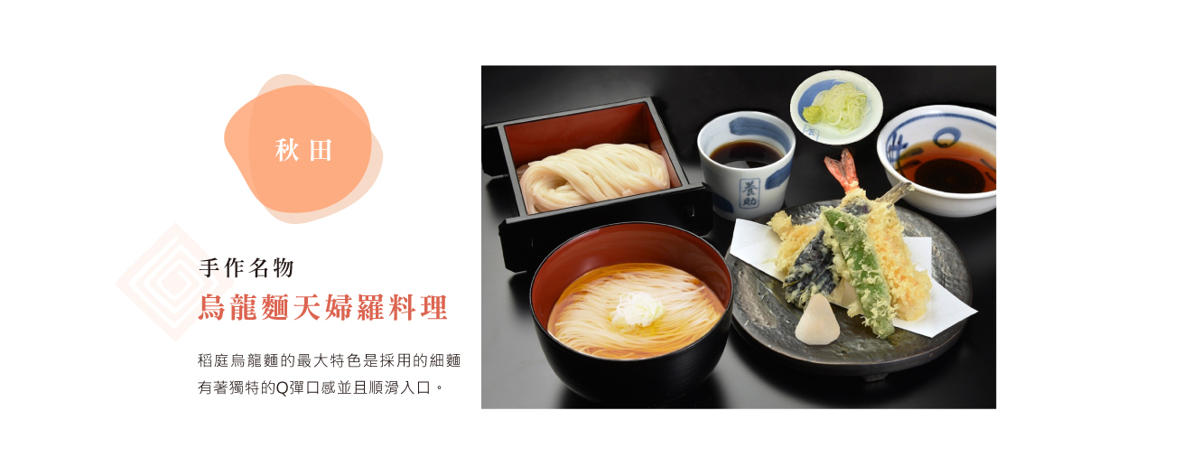 日本三大烏龍麵分為:秋田縣的「稻庭烏龍麵」、香川縣的「讚岐烏龍麵」及群馬縣的「水澤烏龍麵」。純手工製作的「稻庭烏龍麵」,曾是進貢皇室的秋田美食,屬於比較扁平的細麵、口感也更為細緻,由於麵條內部有氣泡,可縮短煮麵時間,不管是做成冷麵、溫麵、拌麵及沾麵,吃起來香Q彈牙,滑順入口。