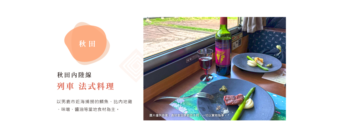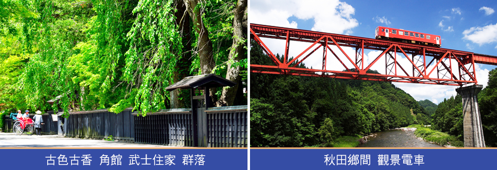 搭乘被譽為日本最漂亮、最原始的風景鐵道「秋田內陸縱貫鐵道」,悠哉的穿行在田野、平原及山區溪谷間,透過車窗,映入眼簾的各色自然景觀,感受多彩的自然畫捲和神祕傳統的「和風」之美,成為難忘的旅行記憶。
