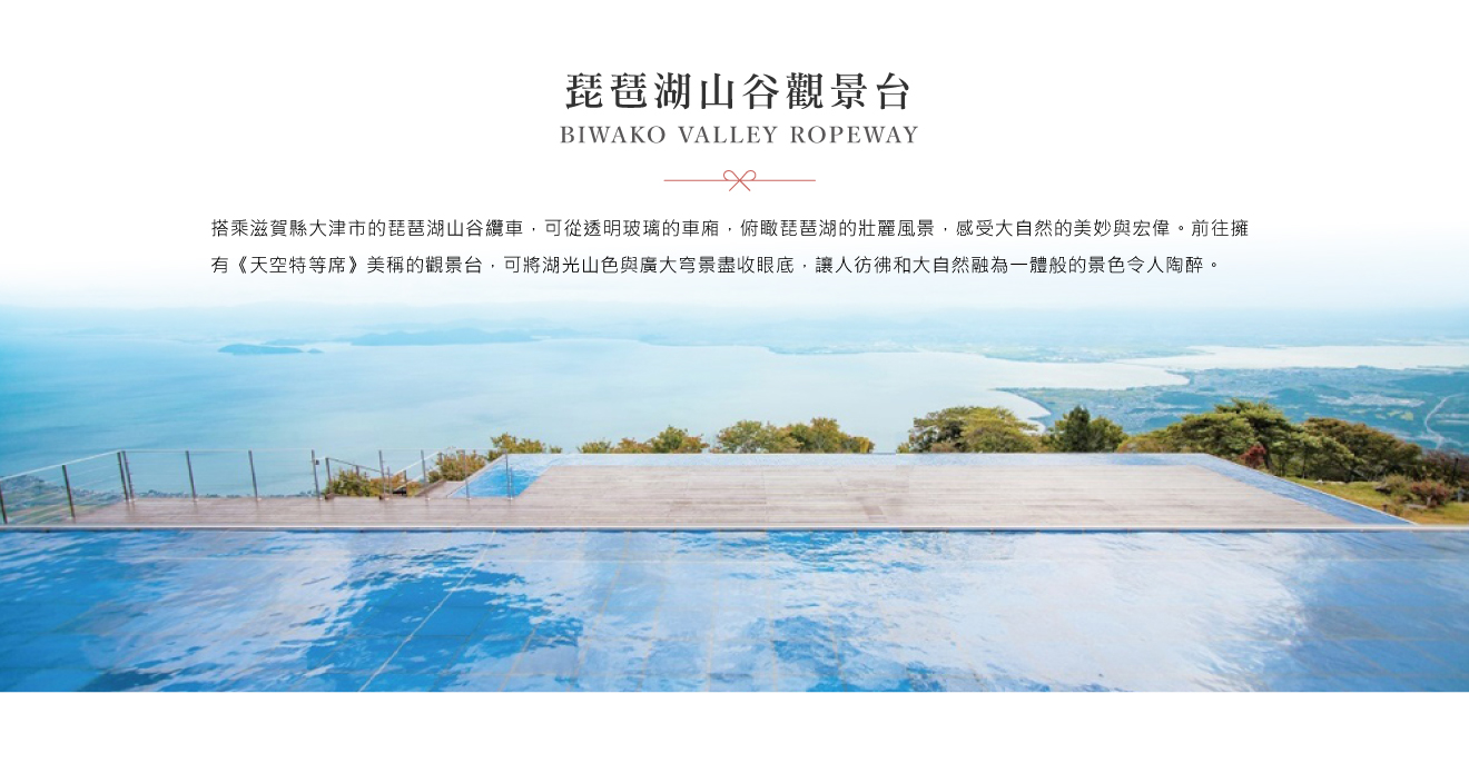搭乘滋賀縣大津市的琵琶湖山谷纜車(BIWAKO VALLEY ROPEWAY),可從透明玻璃的車廂,俯瞰琵琶湖的壯麗風景,感受大自然的美妙與宏偉。前往擁有《天空特等席》美稱的觀景台,可將湖光山色與廣大穹景盡收眼底,讓人彷彿和大自然融為一體般的景色令人陶醉。