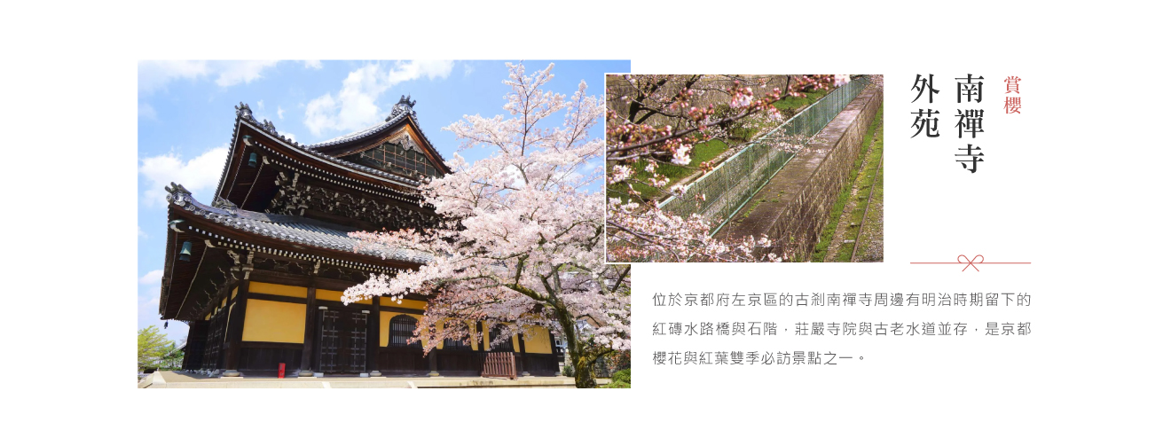 位於京都府左京區的古剎南禪寺周邊有明治時期留下的紅磚水路橋與石階,莊嚴寺院與古老水道並存,是京都櫻花與紅葉雙季必訪景點之一。