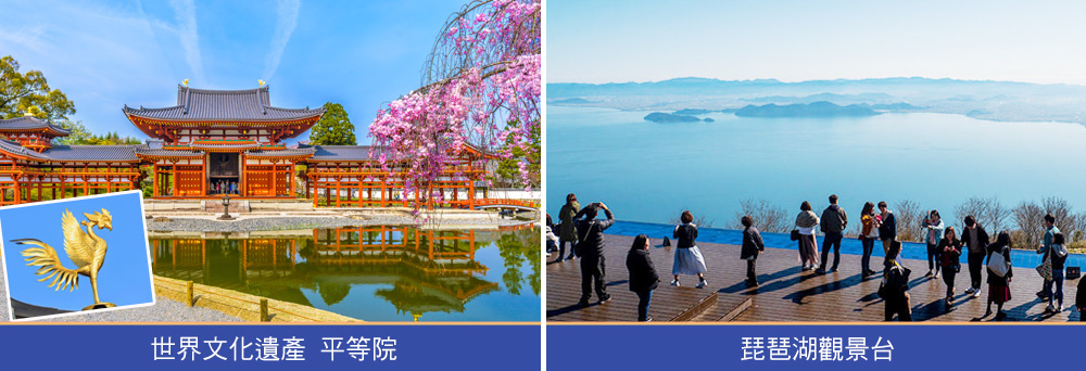 位於京都府宇治市的「平等院」是平安時代的建築代表作,被列為世界文化遺產,木造建築淳樸典雅,如鳳凰展翼姿態的「鳳凰堂」,坐落在阿字池上,彷彿浮在水面上的極樂宮殿,營造一種超脫的仙境和極樂淨土的氛圍,裝飾在鳳凰堂頂端的青銅鳳凰,成為日本10圓硬幣及萬圓鈔票的圖案。園中季節花卉開放,春夏秋冬各有不同風情。