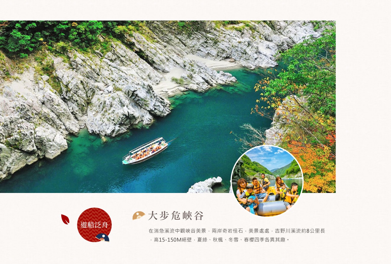 位於德島縣三好市的大步危峽谷,據說在這片地勢險峻的地區「跨大步走危險,邁小步走也危險」,因而得名。搭船遊大步危峽谷,在湍急溪流中觀賞峽谷美景,兩岸奇岩怪石,美景處處,春櫻、夏綠、秋楓、冬雪,四季各異其趣。