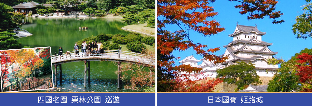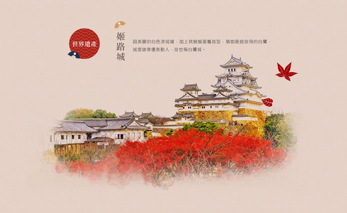 位於兵庫縣姬路市世界文化遺產日本國寶的姬路城,因美麗的白色漆城牆,加上其蜿蜒屋簷造型,猶如展翅欲飛的白鷺,故也稱白鷺城。進入聯立式優美天守閣大小三城堡內,參觀城內展示的寶物。因未被戰災摧毀過,保存非常完整。德川家康之孫女千姬,曾住城內多年,其生平充滿傳奇與變數之淒美愛情典故。秋天,白牆黛瓦的姬路城在紅、黃、綠葉交錯下,美得像一幅細膩的油畫。