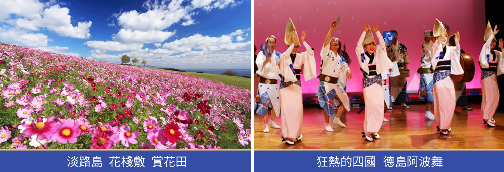 位於兵庫縣淡路島的兵庫縣立公園「淡路花棧敷(あわじ花さじき)」,一望無際的花海,春天有黃澄澄的油菜花、小巧的姫金魚草與嬌豔的罌粟花;夏季盛開粉紫的柳葉馬鞭草、紫色鼠尾草與充滿朝氣的向日葵;秋天有著豔紅的爆竹紅、可愛的波斯菊,冬季則是紫羅蘭,依山坡一大片迎風搖曳的花朵是拍照最好的題材。在展望台上可將明石海峽和大阪灣風光,盡收眼底,海與花朵交疊成一幅美麗圖畫。