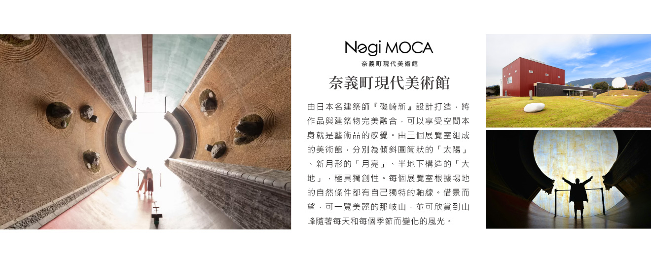位於岡山縣勝田郡奈義町的現代美術館(俗稱Nagi MOCA),由日本名建築師『磯崎新』設計打造,將作品與建築物完美融合,可以享受空間本身就是藝術品的感覺。由三個展覽室組成的美術館,分別為傾斜圓筒狀的「太陽」、新月形的「月亮」、半地下構造的「大地」,極具獨創性。每個展覽室根據場地的自然條件都有自己獨特的軸線。借景而望,可一覽美麗的那岐山,並可欣賞到山峰隨著每天和每個季節而變化的風光。