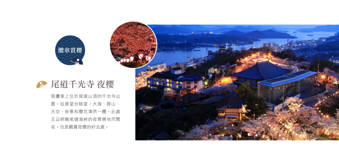 位於廣島縣尾道市「千光寺公園」,每到花季,園內覆滿粉紅色的花海,讓人為之驚嘆。在展望台可俯瞰尾道街景和瀨戶內海與櫻花構成一幅動人畫卷。