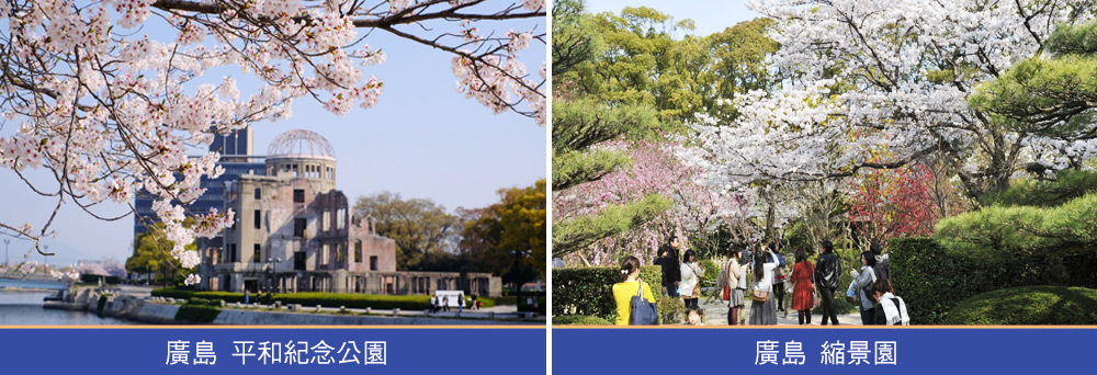廣島是世界上第一個遭到原子彈襲擊的城市,位在爆炸中心附近建造的「平和紀念公園」,是為和平祈願的公園。整個園區扮演著警示世人原爆恐怖的角色,紀念著在原爆中犧牲的無辜生命。春天,柔美的粉色櫻花與嚴肅的歷史建築交錯,讓人感受到和平的珍貴和歲月靜好的幸福。