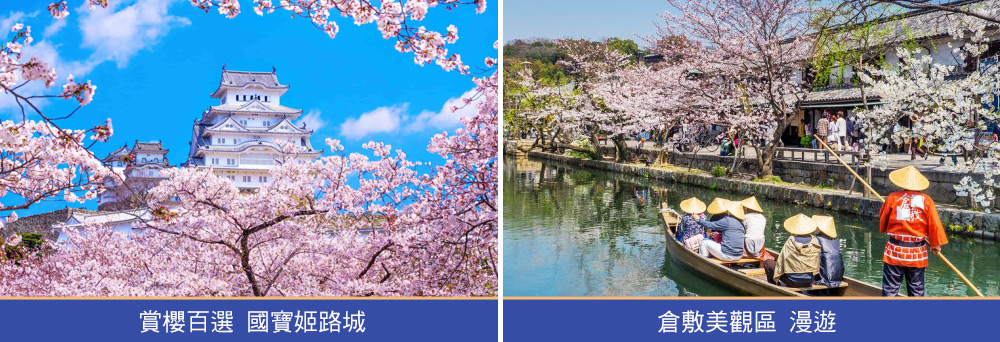 位於兵庫縣姬路市的「姬路城」擁有日本國寶、世界文化遺產的殊榮,也因白色漆城牆以及飛簷造型,猶如展翅的白鷺,被譽為「白鷺城」。因未被戰災摧毀過,保存非常完整,被譽為「日本第一名城」。德川家康之孫女千姬,曾住城內多年,其生平充滿傳奇與變數之淒美愛情典故。櫻花季時,白色的城牆彷彿懸浮在粉紅色的花海上,美不勝收。