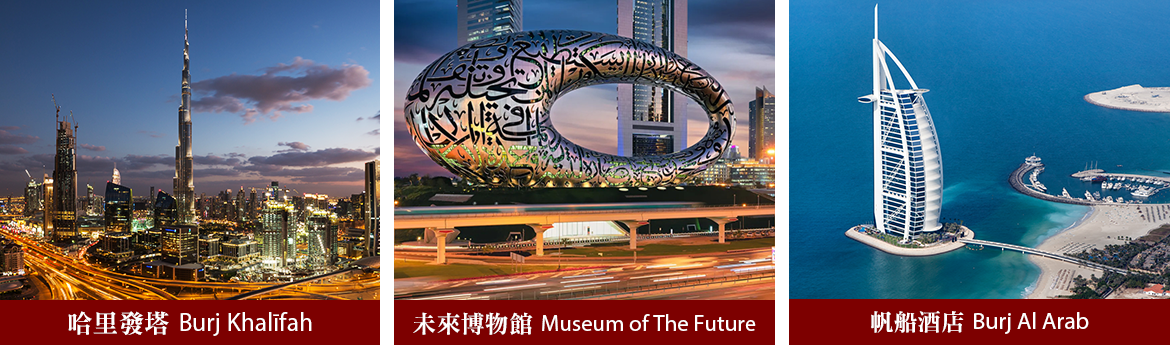 整理行裝,懷著愉快的心情前往國際機場集合,一同搭機、越過千萬里歐亞絲路,兩頓飯、三杯酒閒談之間,飛往全球聚焦的沙漠傳奇~杜拜,迎接即將到來的精彩旅程。