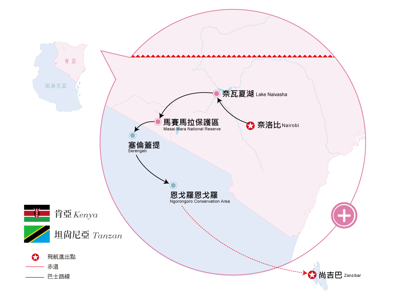 今日,我們將帶著期待的心情從桃園國際機場出發,搭乘空中豪華客機經由轉機點飛往「人類起緣的搖籃」─肯亞。飛行航線沿著赤道往西行,班機於次日抵達肯亞首都奈洛比。