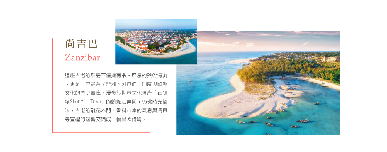 早餐後前往阿魯沙,用完午餐後搭機從狂野的非洲大草原,穿越到湛藍的印度洋海島★尚吉巴Zanzibar為您的坦尚尼亞之旅增添一抹獨特的風情。這座古老的群島不僅擁有令人屏息的熱帶海灘,更是一座融合了非洲、阿拉伯、印度與歐洲文化的歷史寶庫。