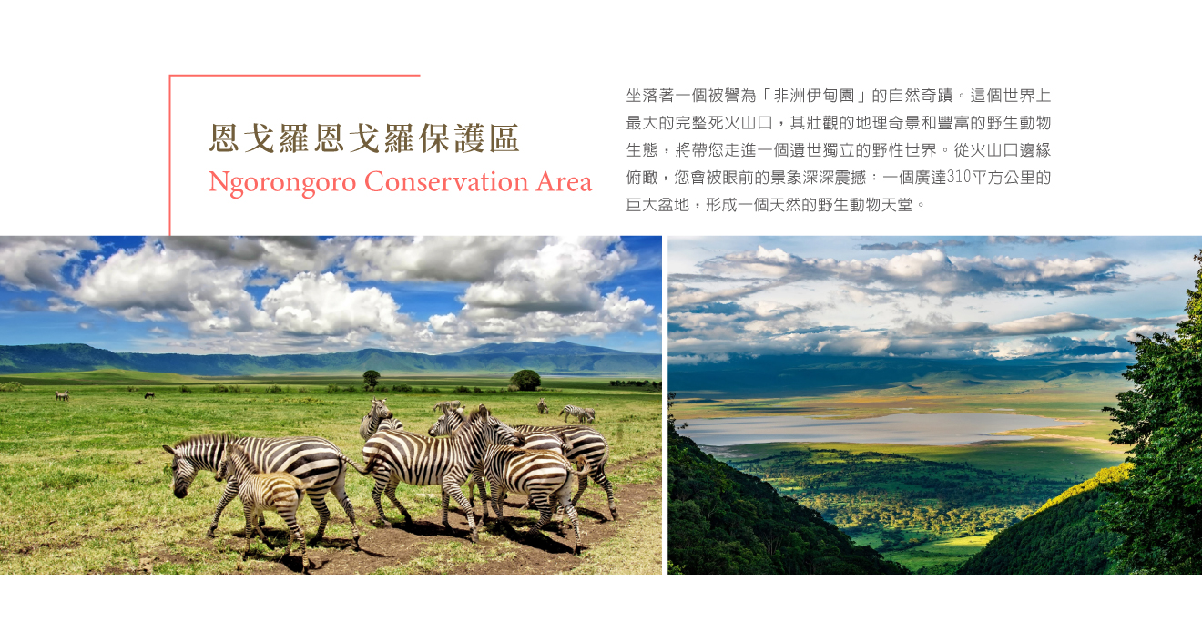 在坦尚尼亞北部,東非大裂谷的懷抱中,坐落著一個被譽為「非洲伊甸園」的自然奇蹟——★恩戈羅恩戈羅保護區Ngorongoro Conservation Area。這個世界上最大的完整死火山口,其壯觀的地理奇景和豐富的野生動物生態,將帶您走進一個遺世獨立的野性世界。從火山口邊緣俯瞰,您會被眼前的景象深深震撼:一個廣達310平方公里的巨大盆地,形成一個天然的野生動物天堂。沿著陡峭的火山口壁緩緩駛入谷底,一個充滿生機的王國將在眼前展開。這裡不僅有廣闊的草原、清澈的湖泊,還有成群的斑馬、牛羚、瞪羚在陽光下悠閒地漫步。