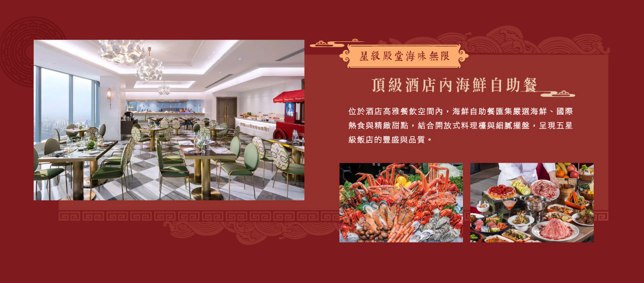 早餐:酒店內 午餐:地方特色中式料理 晚餐:特別安排頂級酒店內精緻中式料理或海鮮自助餐