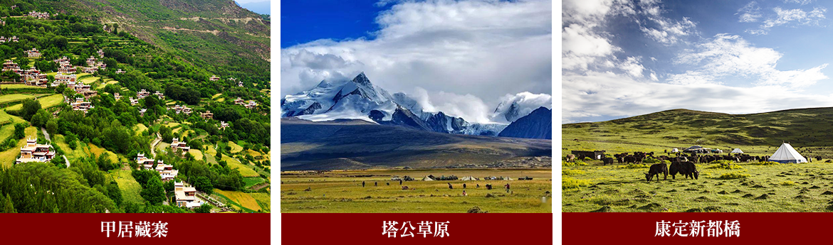 【甲居藏寨】海拔約2000多公尺,居住著數百戶嘉絨藏族,到目前仍維持藏族傳統的建築風格、外牆多數以紅色、白色、棕色和黑色條紋圖案爲主,並以日、月、星和宗教圖案點綴,外觀美麗而整潔;作爲丹巴藏寨建築群的代表,甲居藏寨曾在2005年《中國國家地理》雜誌的「選美中國」活動中被評爲「中國最美鄉村」,在2006年,更被評爲「中國最美的六大鄉村古鎮」之首。