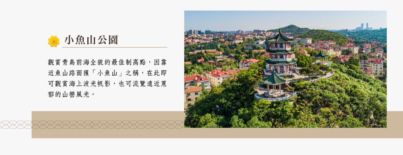 【小魚山公園】海拔並不高只有60公尺,是觀賞青島前海全貌的最佳制高點,因靠近魚山路而獲"小魚山"之稱,小魚山之巔的主建築"覽潮閣",是一座18公尺高的三層八角挑簷式建築,遊人在此可觀賞海上波光帆影,也可流覽遠近蔥郁的山巒風光。