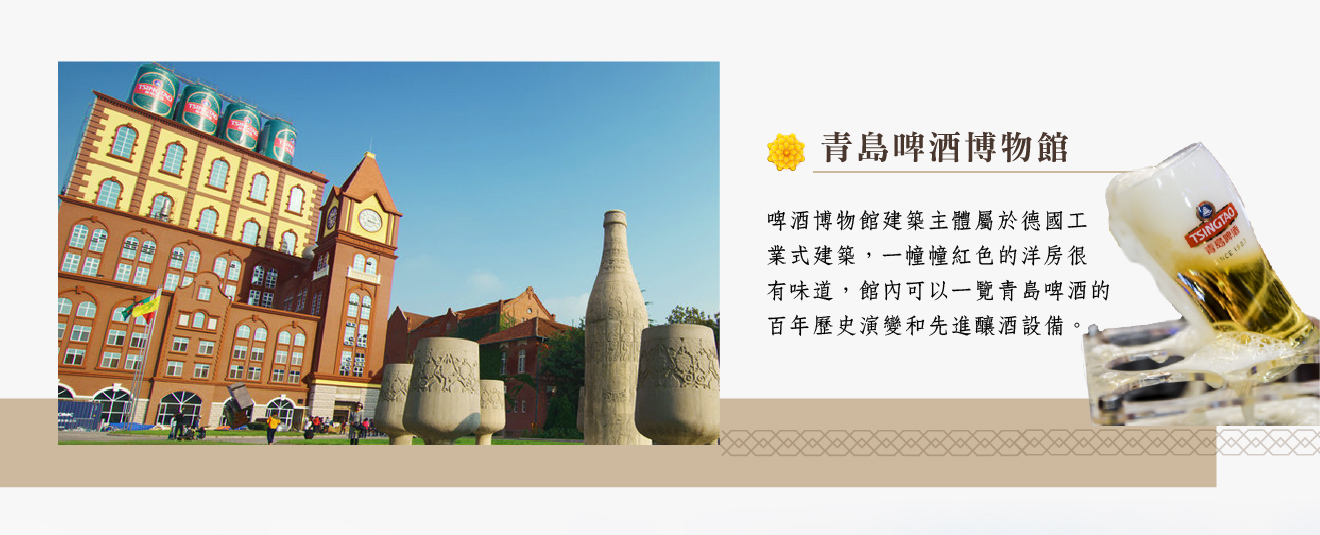 【青島啤酒博物館】青島啤酒是享譽中外的國際知名品牌,從清代建廠至今囊括了無數國內外大獎,綜觀其歷史發展及生展規模,都堪稱亞洲第一,啤酒博物館建築主體屬於德國工業式建築,一幢幢紅色的洋房很有味道,館內可以一覽青島啤酒的百年歷史演變和先進釀酒設備,更可以大啖啤酒豆、暢飲原漿生啤酒,享盡文化與美食結合的樂趣,不但成為國家級重點文物保護單位,更獲選為國家AAAA級旅遊景區。