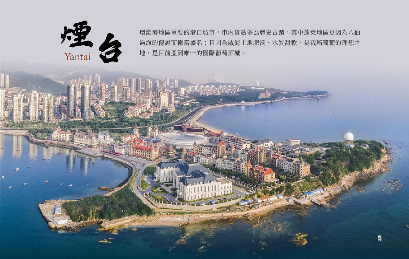 【煙台】是環渤海地區重要的港口城市,古為東夷族地,歷史悠久,是古代早期文化發祥地之一,市內景點多為歷史古蹟,其中蓬萊地區更因為八仙過海的傳說而極富盛名;且因為土地肥沃、水質甜軟,是栽培葡萄的理想之地,因此當地著名的紅葡萄酒產業為煙台帶來了大量的觀光及商業機會,這裡是目前亞洲唯一的國際葡萄酒城和全國最大的葡萄酒產區。