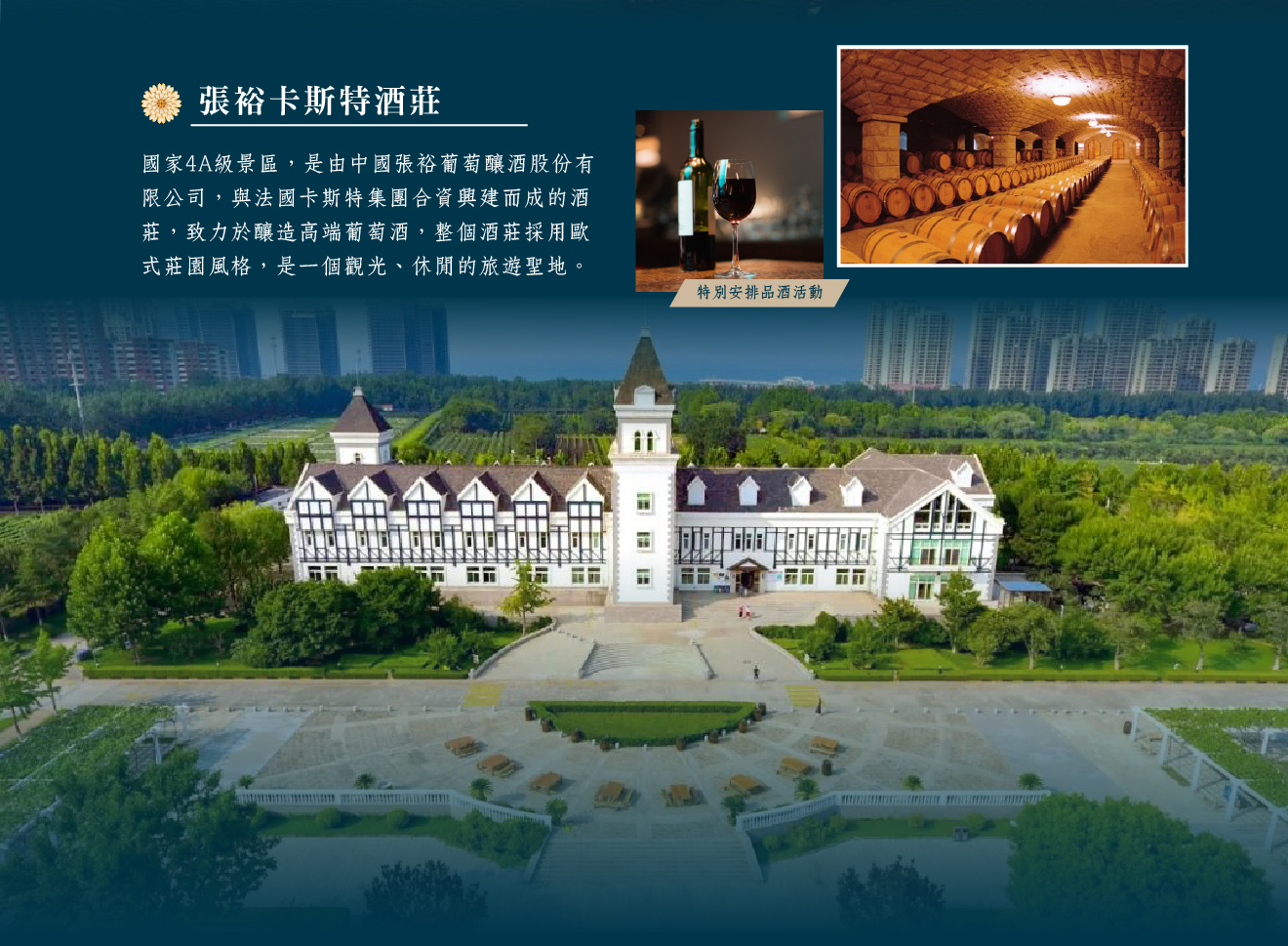 【張裕卡斯特酒莊】國家4A級景區,是由中國張裕葡萄釀酒股份有限公司,與法國卡斯特集團合資興建而成的酒莊,致力於釀造高端葡萄酒,整個酒莊採用歐式莊園風格,包含主體建築、釀酒葡萄園、葡萄長廊等,可以享受到滿滿歐式風情,是一個觀光、休閒的旅遊聖地。在此特別安排品酒活動,感受葡萄酒特別的魅力。