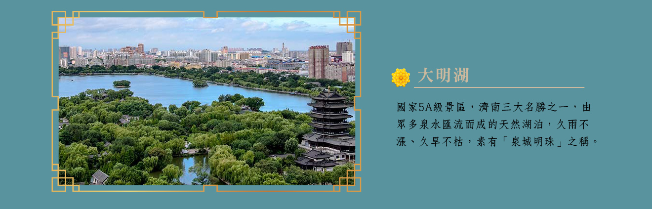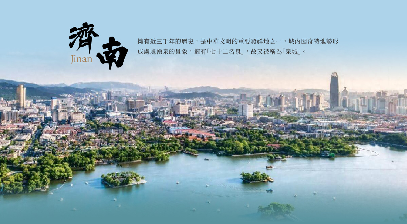 【濟南】為山東省省會,擁有近三千年的歷史,是中華文明的重要發祥地之一,城內因奇特地勢形成處處湧泉的景象,擁有「七十二名泉」,故又被稱為「泉城」;清代名著「老殘遊記」中對大明湖的描寫,加上千佛山、五峰山、靈岩寺等名山丰姿構成了「一城山色半城湖」的獨特風光,使得濟南成為山東觀光發展重地。