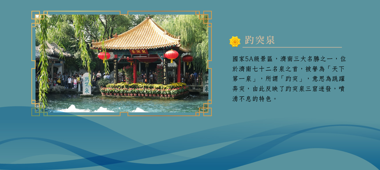 【趵突泉】國家5A級景區,濟南三大名勝之一,位於濟南七十二名泉之首,被譽為「天下第一泉」,所謂「趵突」,意思為跳躍奔突,由此反映了趵突泉三窟迸發,噴湧不息的特色,每日湧出至少7萬立方公尺的水量,泉水清澈見底,是理想的天然飲用水,故有「不飲趵突泉水,空遊濟南一回」之說。