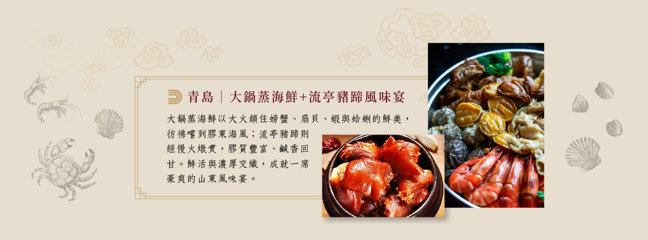 早餐:酒店內 午餐:特別安排大鍋蒸海鮮風味宴 晚餐:特別安排百年字號和豐德酒樓正宗魯菜料理或豪華酒店內精緻中式料理