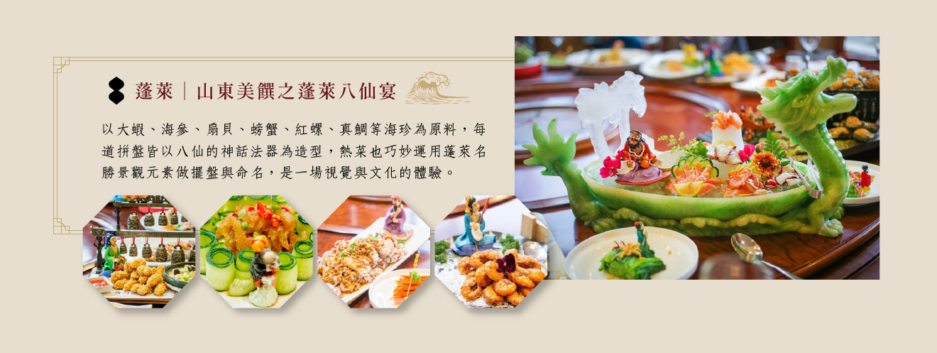 早餐:酒店內 午餐:特別安排山東美饌之蓬萊八仙宴 晚餐:特別安排豪華酒店內中式或海鮮自助式料理