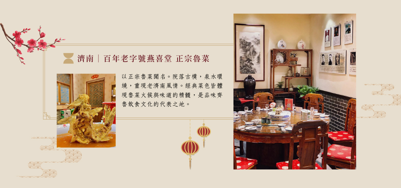 早餐:酒店內 午餐:特別安排網紅打卡名店老字號燕喜堂魯菜料理 晚餐:特別安排濟南名店道地泉水宴