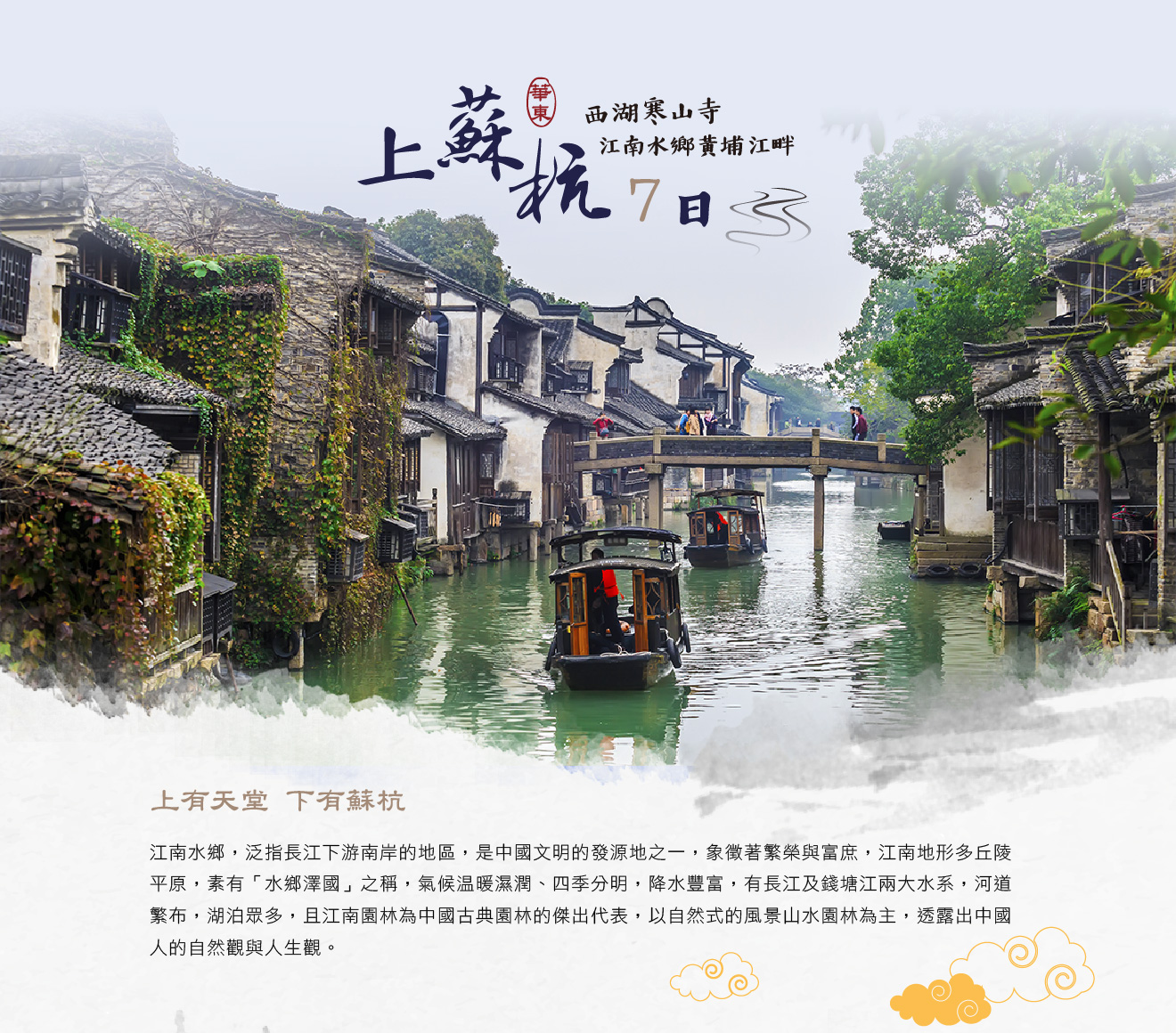 創意中國上蘇杭~京杭大運河西湖寒山寺江南水鄉黃埔江畔和平飯店宴饗經典7天