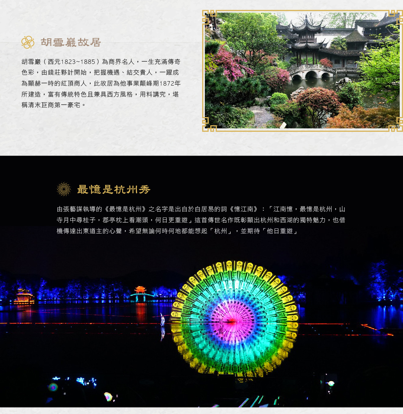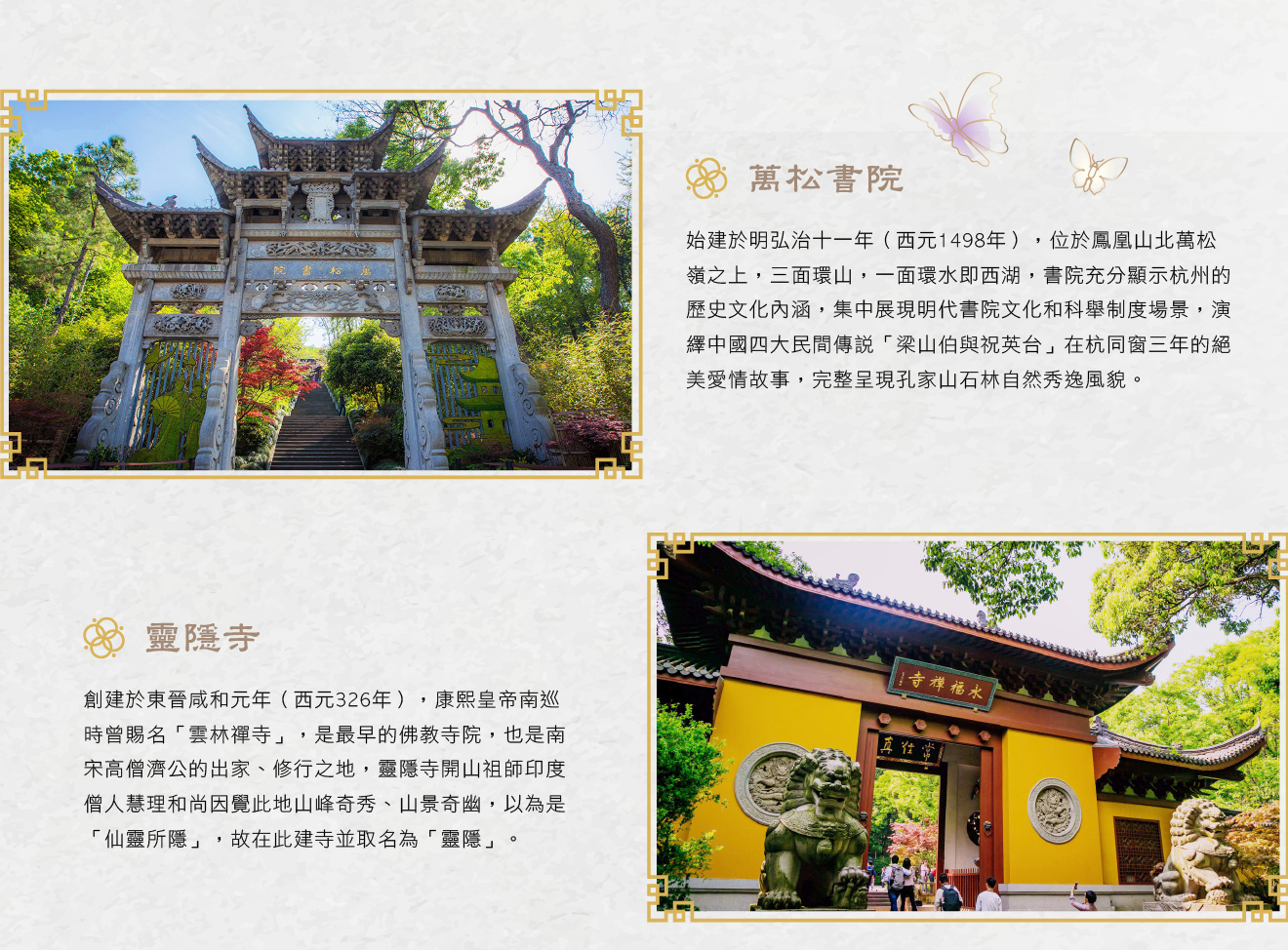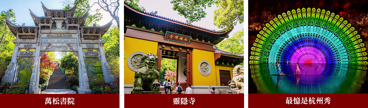 杭州~梁山伯祝英台之萬松書院、飛來峰景區、靈隱寺、 電瓶車遊西湖、三潭映月遊船、雷峰夕照電梯登頂、 160年樓外樓餐廳晚餐、印象西湖~最憶是杭州秀