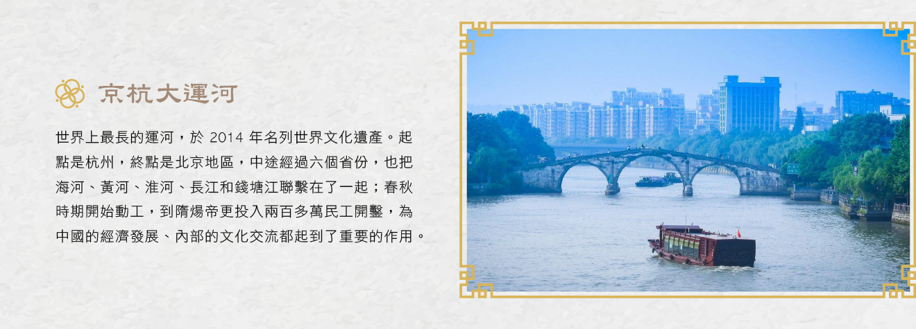 【船遊京杭大運河遊船】這條人工運河連接了中國的南方與北方,是世界上最長的運河達1797公里,起點是杭州,終點是北京地區,中途經過了六個省份天津、河北、河南、山東、江蘇和浙江,也把海河、黃河、淮河、長江和錢塘江聯繫在了一起;在春秋時期開始動工,到隋煬帝更投入兩百多萬民工開鑿這運河,這樣大規模的修建奠定了京杭大運河成為世界上最長運河的基礎,為中國的經濟發展、內部的文化交流都起到了重要的作用;在2014年名列世界文化遺產。
