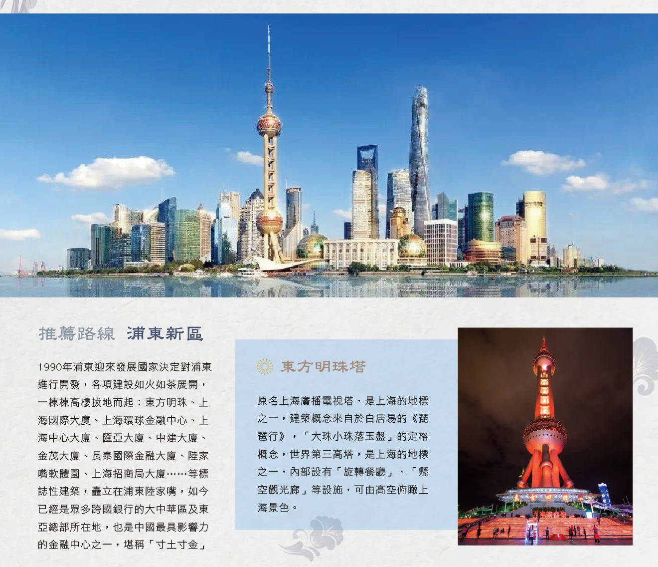 【外灘、船遊黃埔江】位於黃浦江畔,即外黃浦灘,為上海重要地標之一,全長約1.5公里是歷史文化街區,1844年起,這一帶被劃為英國租界,成為上海十裡洋場的真實寫照,也是舊上海租界區以及整個上海近代城市開始的起點,擁有數十棟的歷史建築,外國的銀行、商行、總會、報社開始在此雲集風格皆不相同,故有「萬國建築博覽群」之譽,後來更成為了中國的金融及貿易中心,亦被稱為「東方華爾街」。